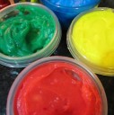 - Vaciamos la mezcla en botellitas y agregamos a cada botellita 1 gota de detergente líquido para trastes y unas gotas de colorante vegetal. Revolvemos y listo, ¡A pintar!